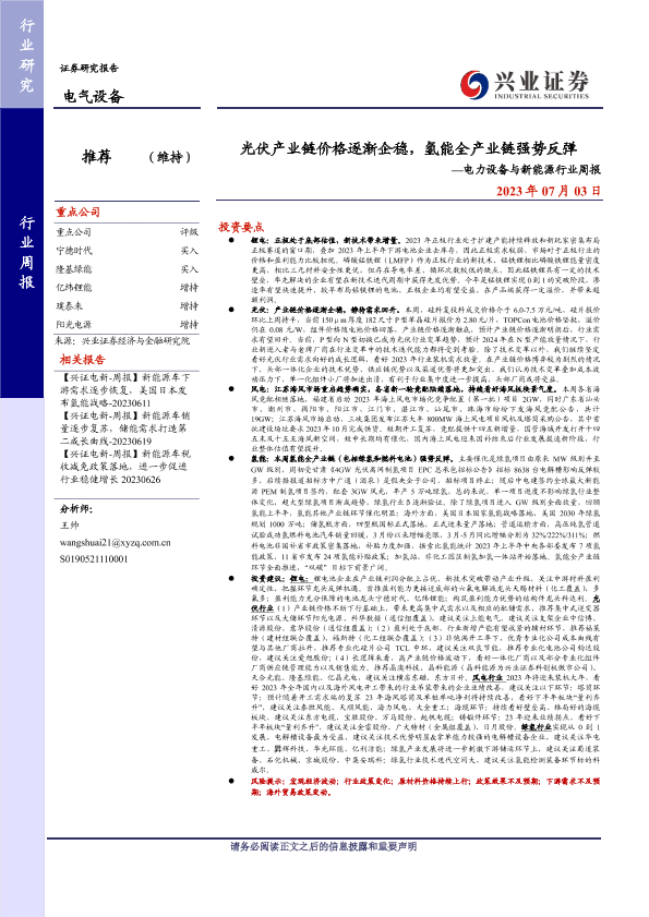 【兴业证券】【20230703】20230703-兴业证券-电力设备与新能源行业周报:光伏产业链价格逐渐企稳,氢能全产业链强势反弹-19页