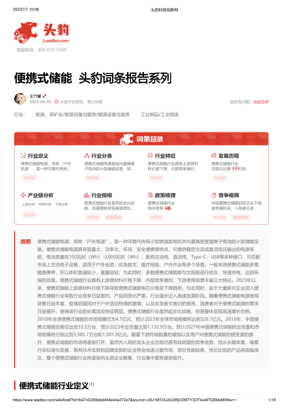 【头豹研究院】【20230505】便携式储能 头豹词条报告系列-18页