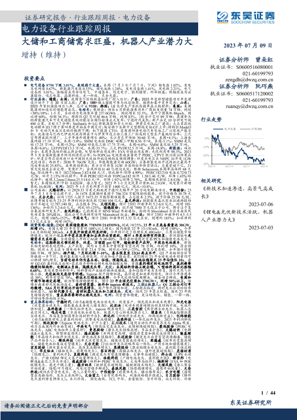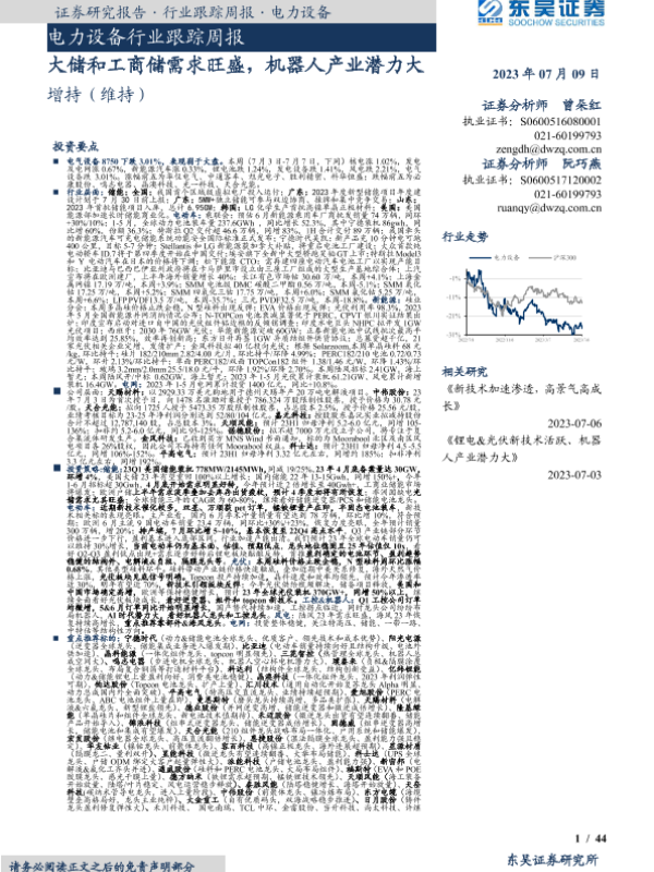 【东吴证券】【20230709】电力设备行业跟踪周报:大储和工商储需求旺盛,机器人产业潜力大-44页