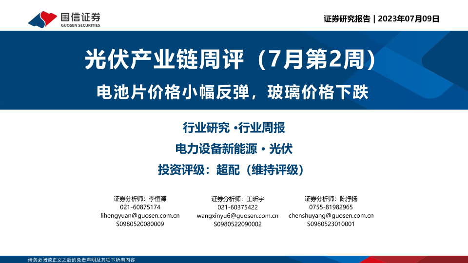 【国信证券】【20230709】光伏产业链周评(7月第2周):电池片价格小幅反弹,玻璃价格下跌-15页