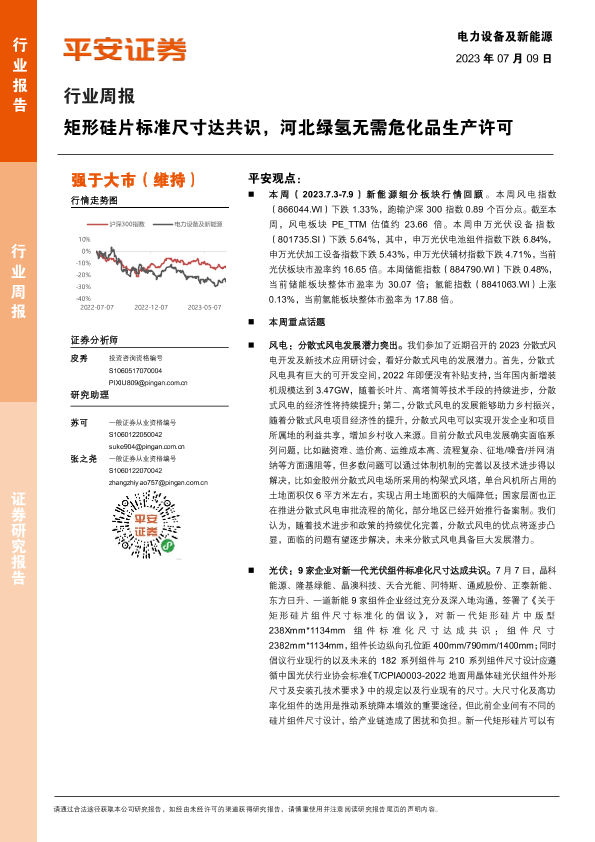 【平安证券】【20230709】电力设备及新能源行业周报:矩形硅片标准尺寸达共识,河北绿氢无需危化品生产许可-21页