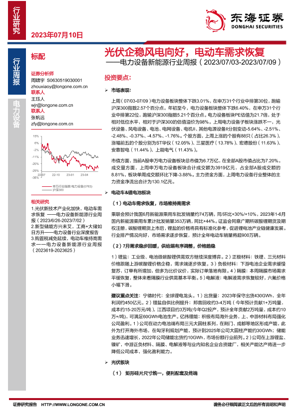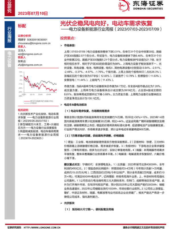 【东海证券】【20230710】20230710-东海证券-电力设备新能源行业周报:光伏企稳风电向好,电动车需求恢复-28页