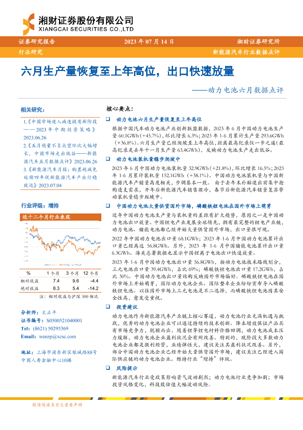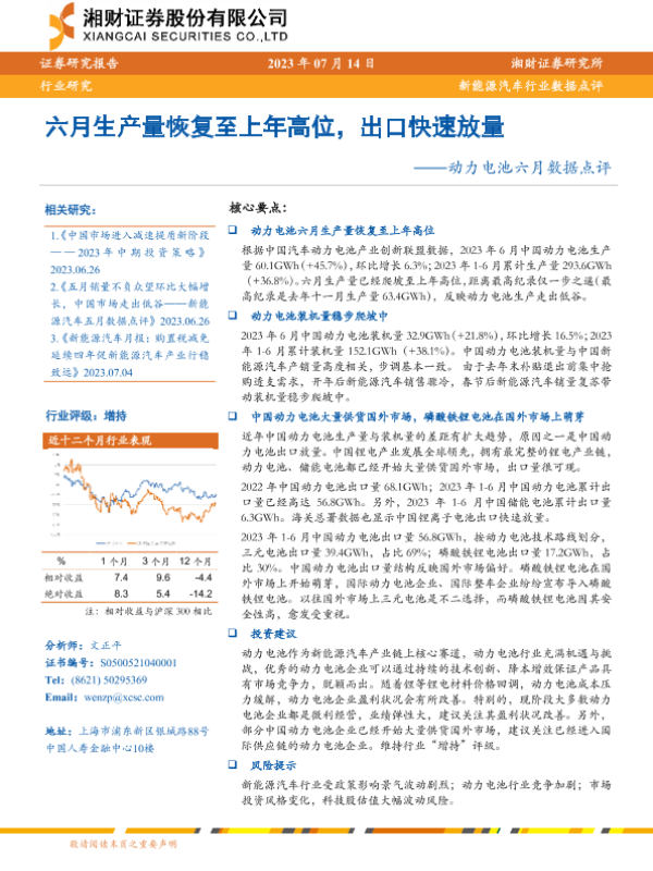 【湘财证券】【20230714】动力电池六月数据点评:六月生产量恢复至上年高位,出口快速放量-10页