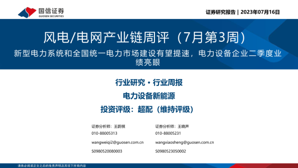 【国信证券】【20230716】风电/电网产业链周评(7月第3周):新型电力系统和全国统一电力市场建设有望提速,电力设备企业二季度业绩亮眼-24页