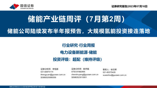 【国信证券】【20230716】储能产业链周评(7月第2周):储能公司陆续发布半年报预告,大规模氢能投资接连落地-28页