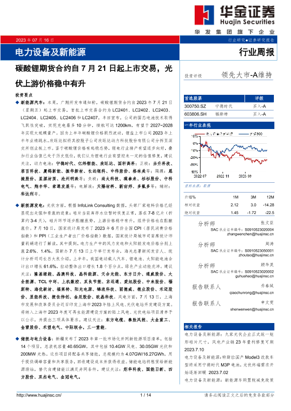 【华金证券】【20230716】电力设备及新能源行业周报:碳酸锂期货合约自7月21日起上市交易,光伏上游价格稳中有升-14页