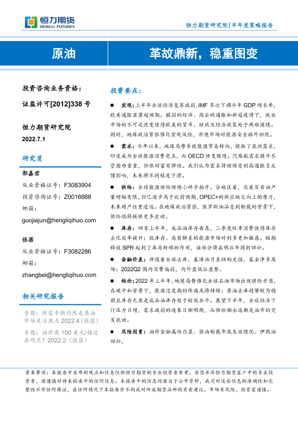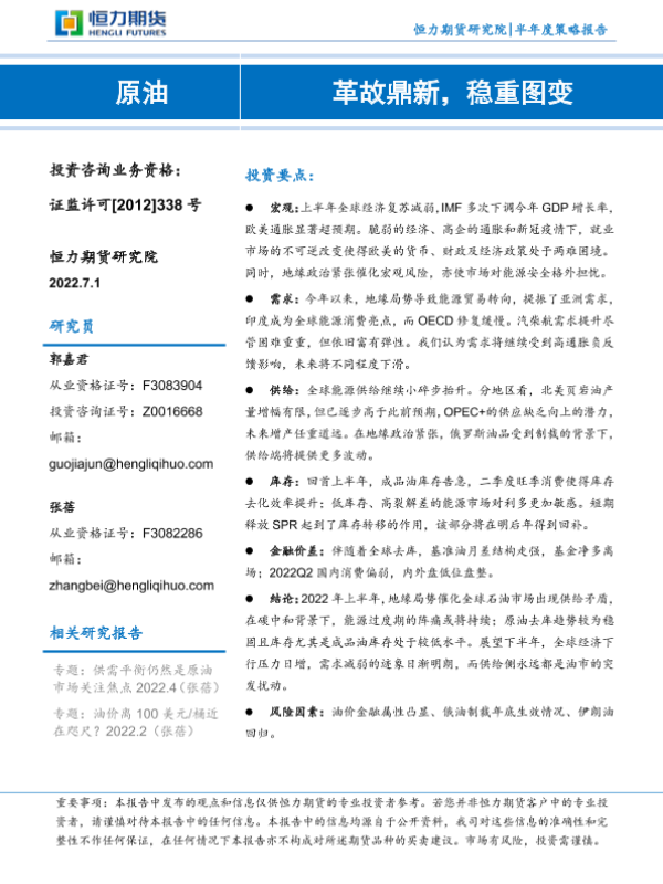【恒力期货】【20220701】原油半年度策略报告:革故鼎新,稳重图变-26页