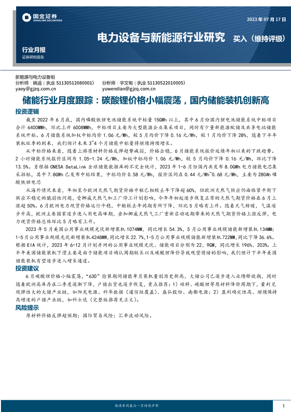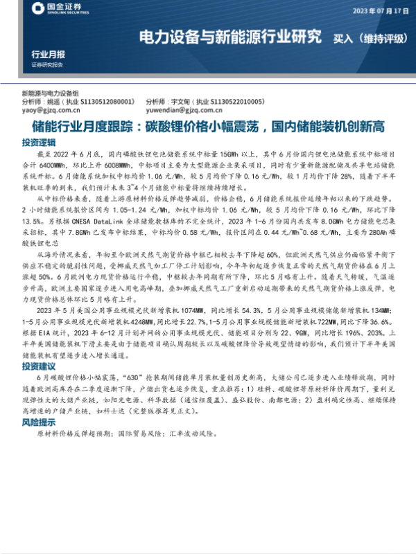 【国金证券】【20230717】储能行业月度跟踪:碳酸锂价格小幅震荡,国内储能装机创新高-12页