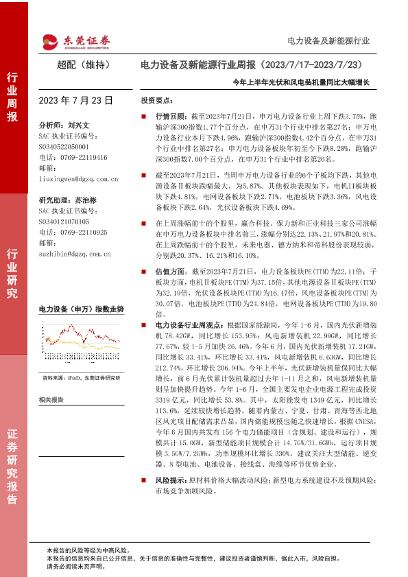 【东莞证券】【20230723】20230723-东莞证券-电力设备及新能源行业周报:今年上半年光伏和风电装机量同比大幅增长-14页