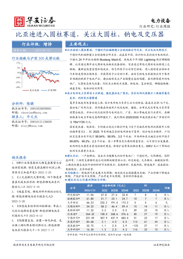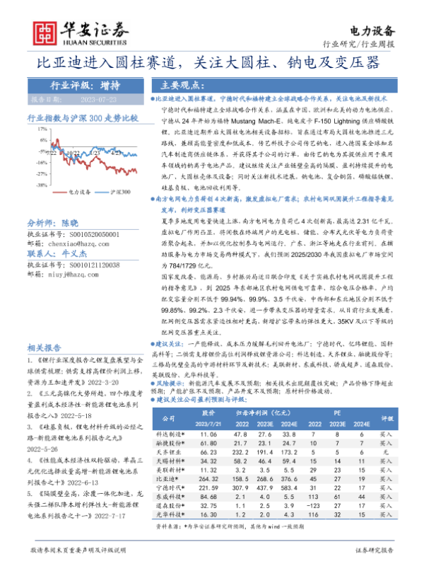 【华安证券】【20230723】20230723-华安证券-电力设备行业周报:比亚迪进入圆柱赛道,关注大圆柱、钠电及变压器-28页