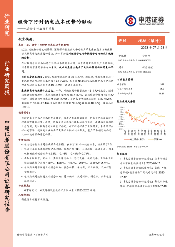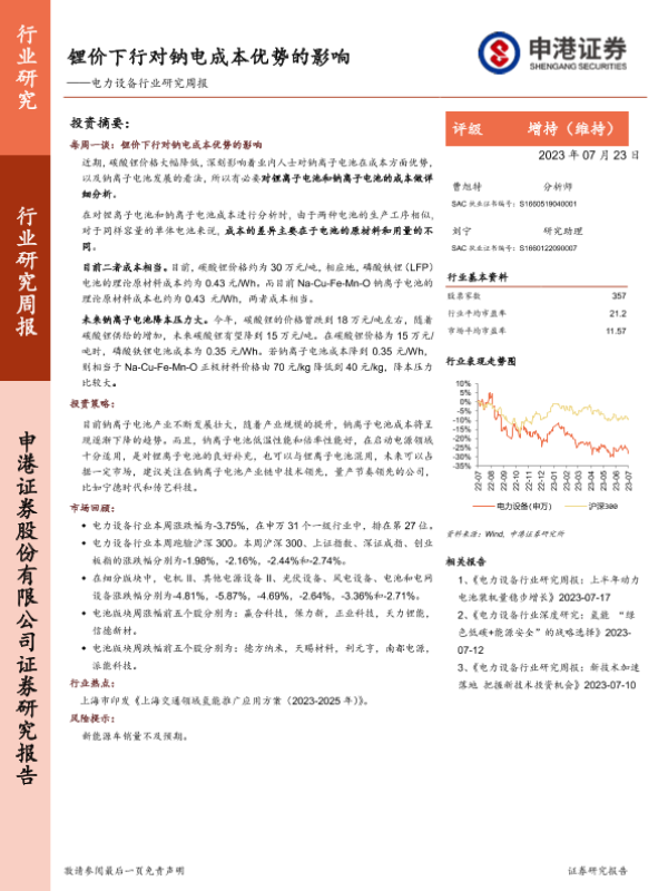 【申港证券】【20230723】20230723-申港证券-电力设备行业研究周报:锂价下行对钠电成本优势的影响-10页