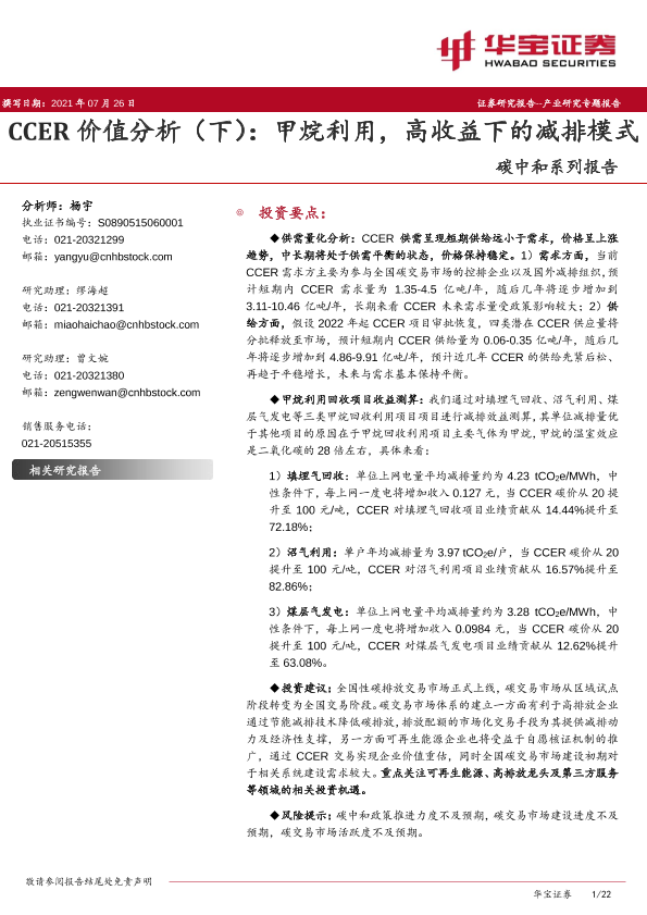【华宝证券】【20210726】碳中和系列报告:CCER价值分析(下):甲烷利用,高收益下的减排模式-22页