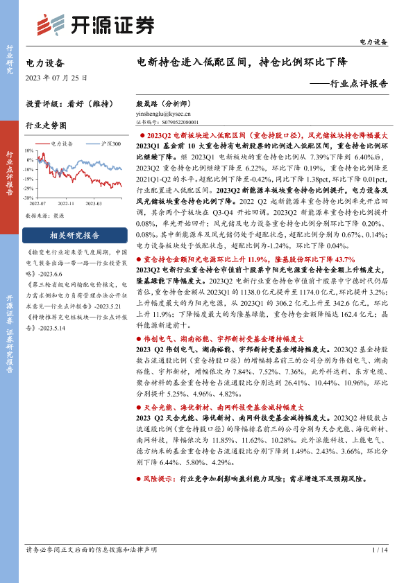 【开源证券】【20230725】20230725-开源证券-电力设备行业点评报告:电新持仓进入低配区间,持仓比例环比下降-14页
