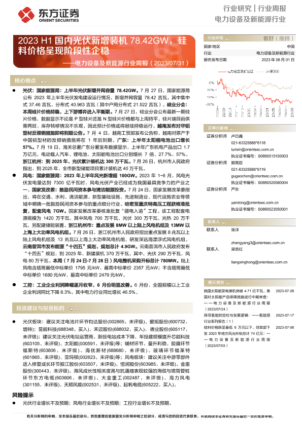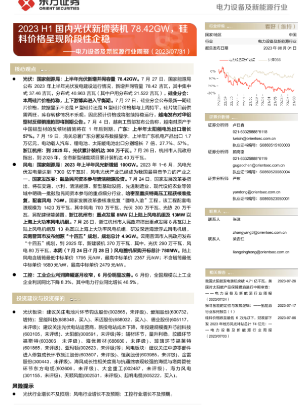 【东方证券】【20230801】20230801-东方证券-电力设备及新能源行业周报:2023H1国内光伏新增装机78.42GW,硅料价格呈现阶段性企稳-13页