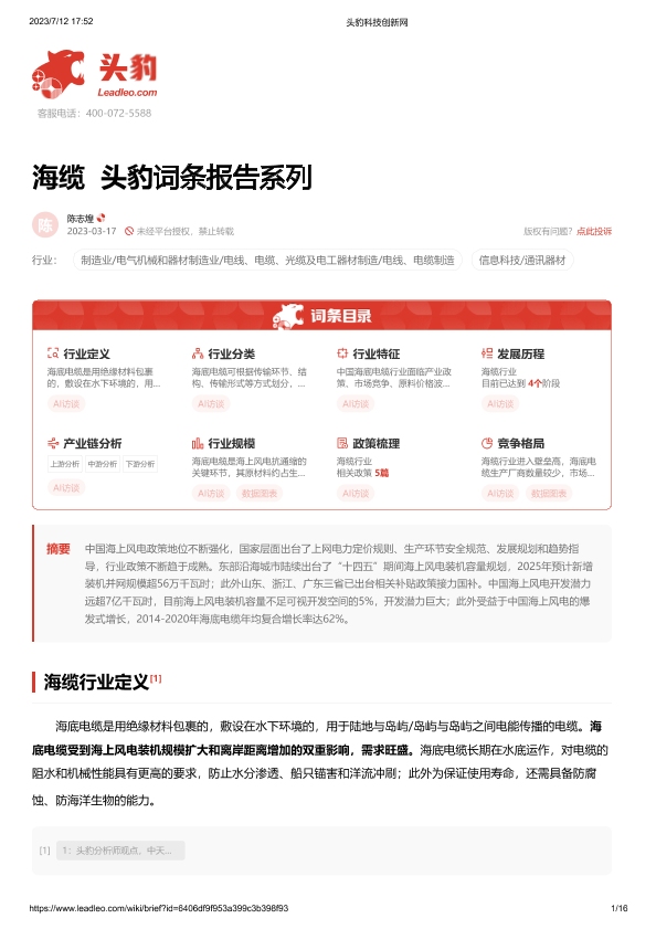 【头豹研究院】【20230317】海缆 头豹词条报告系列-16页