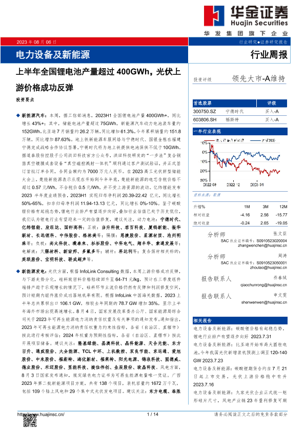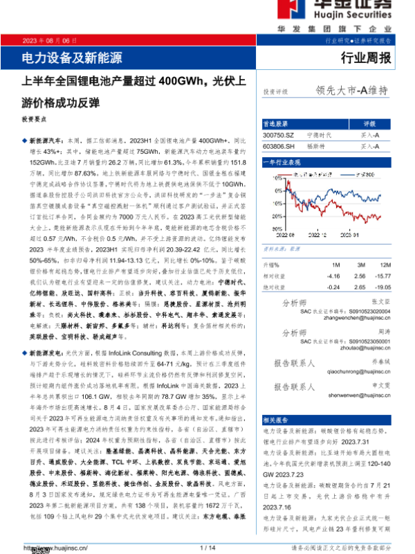 【华金证券】【20230806】电力设备及新能源行业周报:上半年全国锂电池产量超过400GWh,光伏上游价格成功反弹-14页