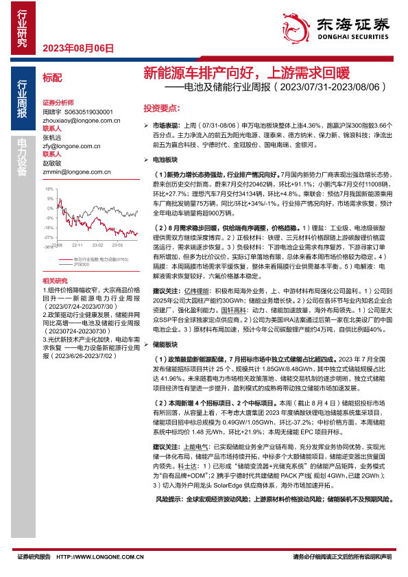 【东海证券】【20230806】20230806-东海证券-电池及储能行业周报:新能源车排产向好,上游需求回暖-13页