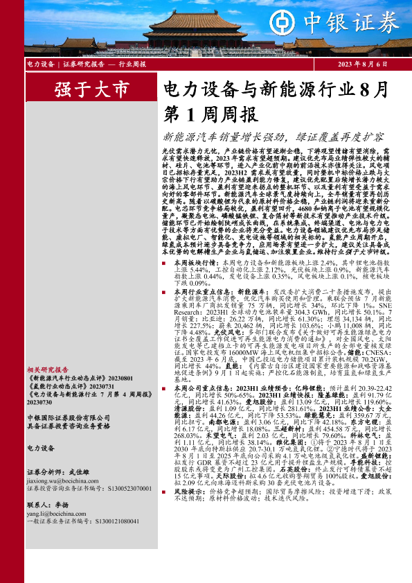 【中银证券】【20230806】电力设备与新能源行业8月第1周周报:新能源汽车销量增长强劲,绿证覆盖再度扩容-16页
