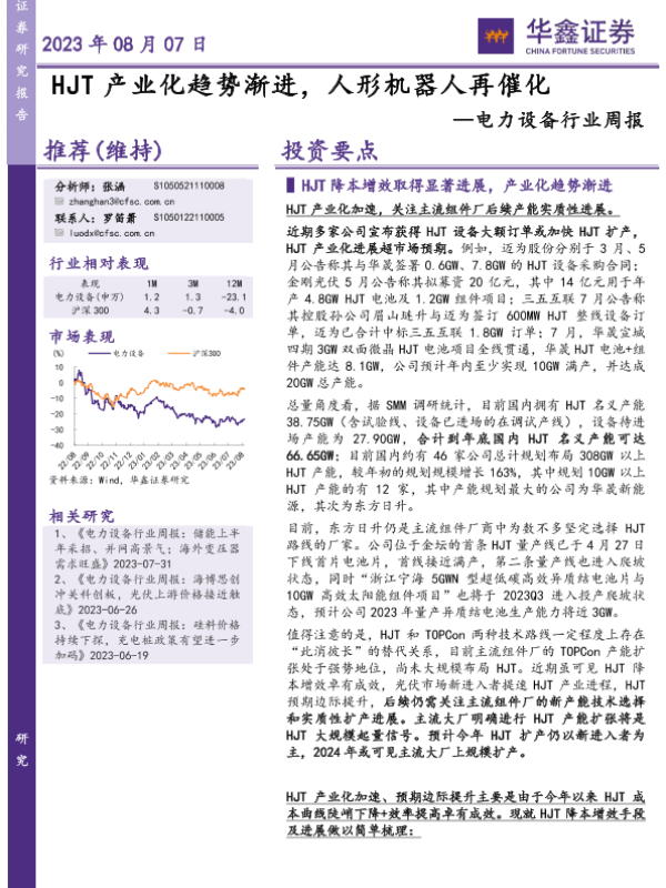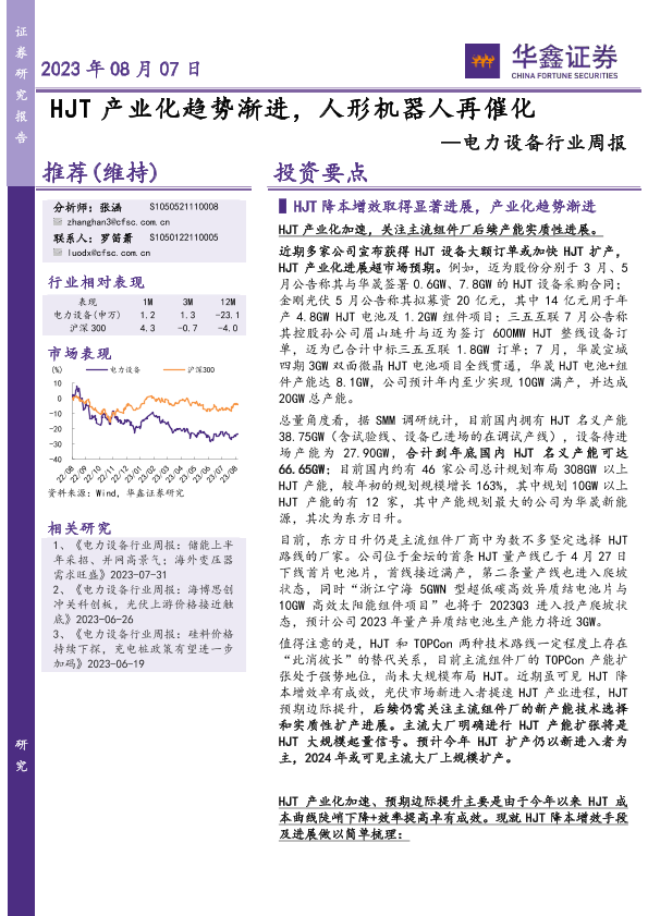 【华鑫证券】【20230807】20230807-华鑫证券-电力设备行业周报:HJT产业化趋势渐进,人形机器人再催化-19页