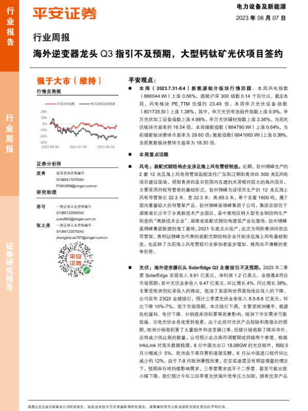 【平安证券】【20230807】电力设备及新能源行业周报:海外逆变器龙头Q3指引不及预期,大型钙钛矿光伏项目签约-25页