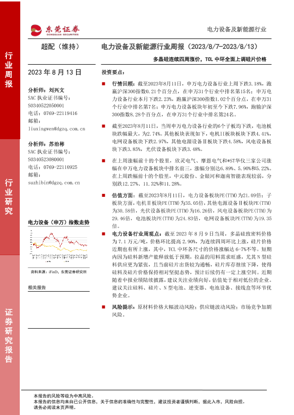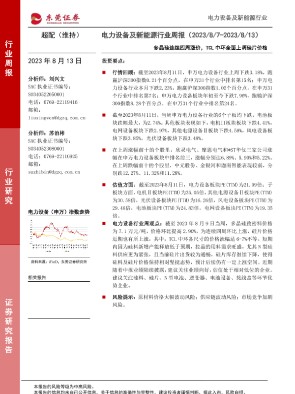 【东莞证券】【20230813】电力设备及新能源行业周报:多晶硅连续四周涨价,TCL中环全面上调硅片价格-13页