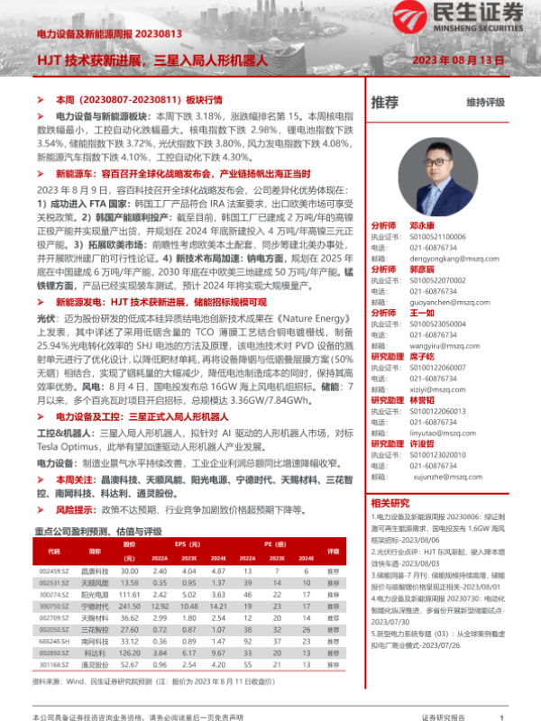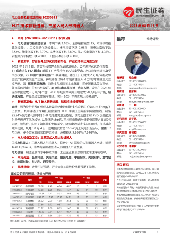 【民生证券】【20230813】电力设备及新能源周报:HJT技术获新进展,三星入局人形机器人-25页
