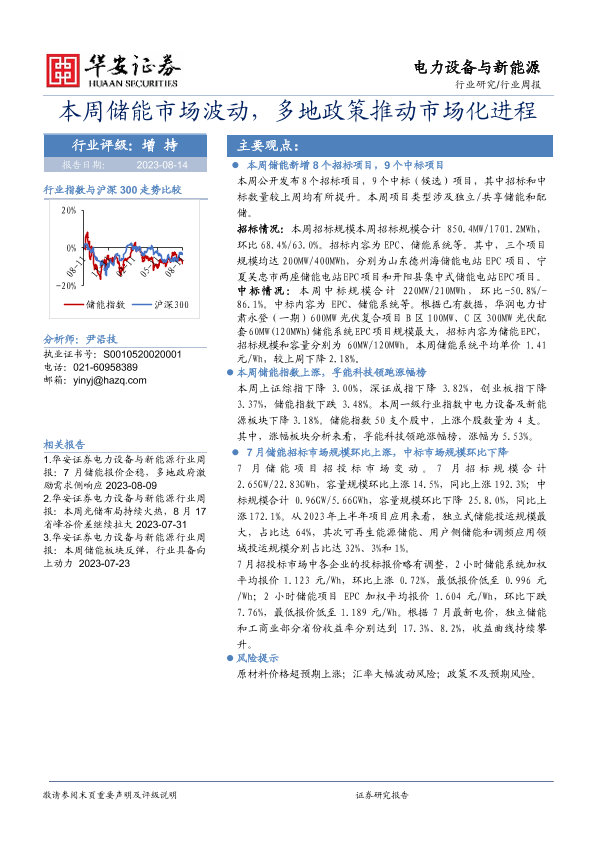 【华安证券】【20230814】20230814-华安证券-电力设备与新能源行业周报:本周储能市场波动,多地政策推动市场化进程-19页
