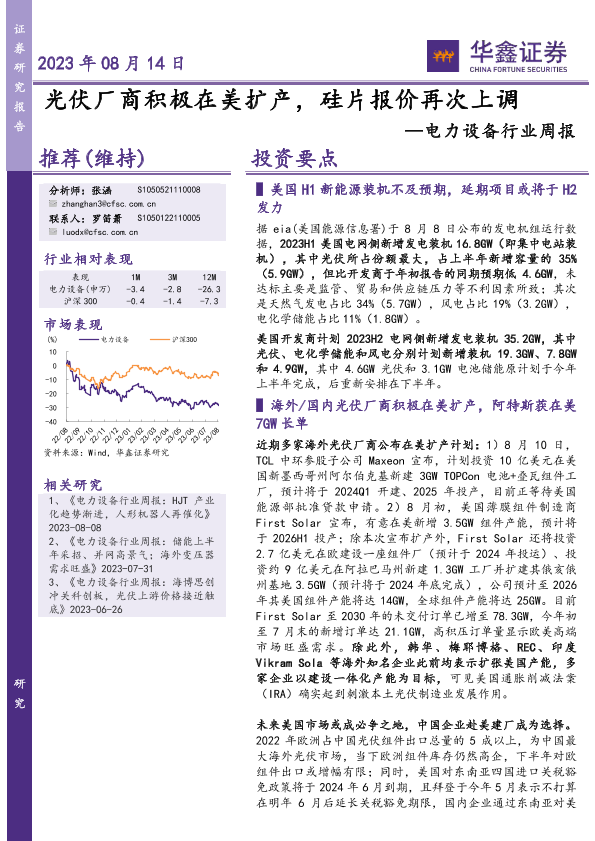 【华鑫证券】【20230814】电力设备行业周报:光伏厂商积极在美扩产,硅片报价再次上调-17页