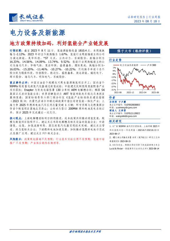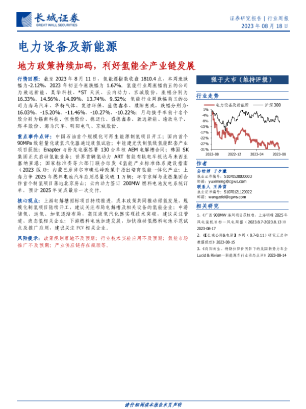【长城证券】【20230818】20230818-长城证券-电力设备及新能源行业周报:地方政策持续加码,利好氢能全产业链发展-10页