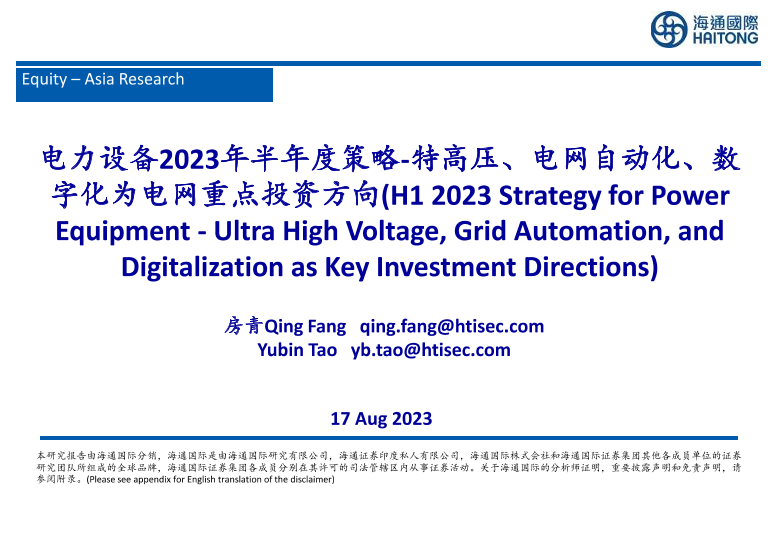 【海通国际】【20230817】电力设备2023年半年度策略:特高压、电网自动化、数字化为电网重点投资方向-38页