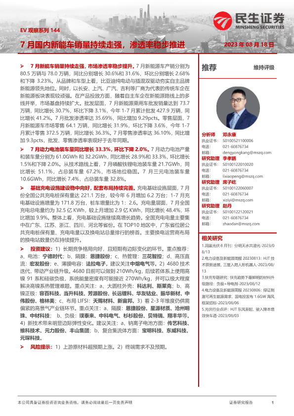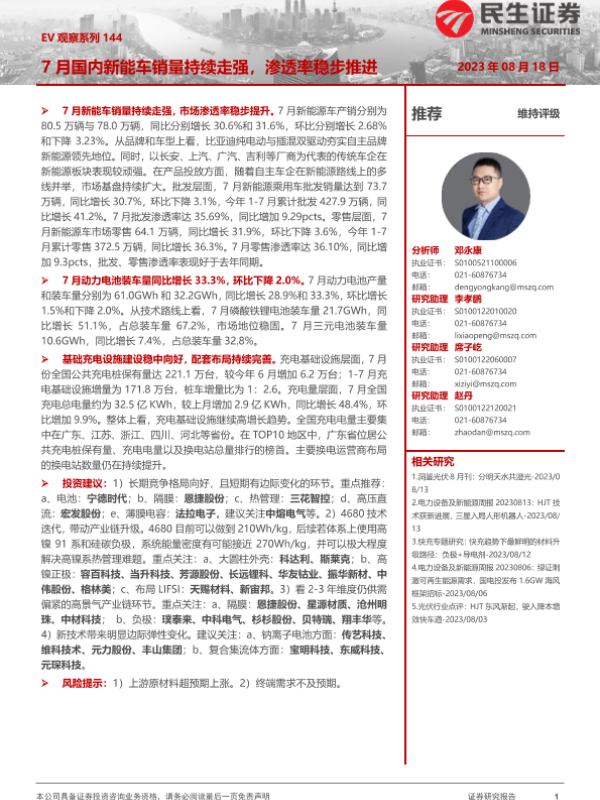 【民生证券】【20230818】EV观察系列144-7月国内新能车销量持续走强,渗透率稳步推进-20页
