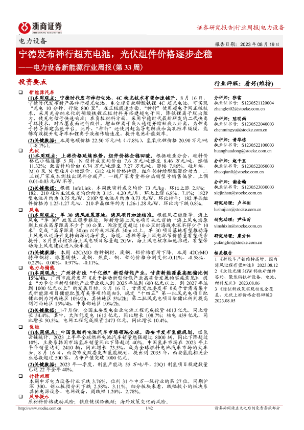 【浙商证券】【20230819】电力设备新能源行业周报(第33周):宁德发布神行超充电池,光伏组件价格逐步企稳-42页