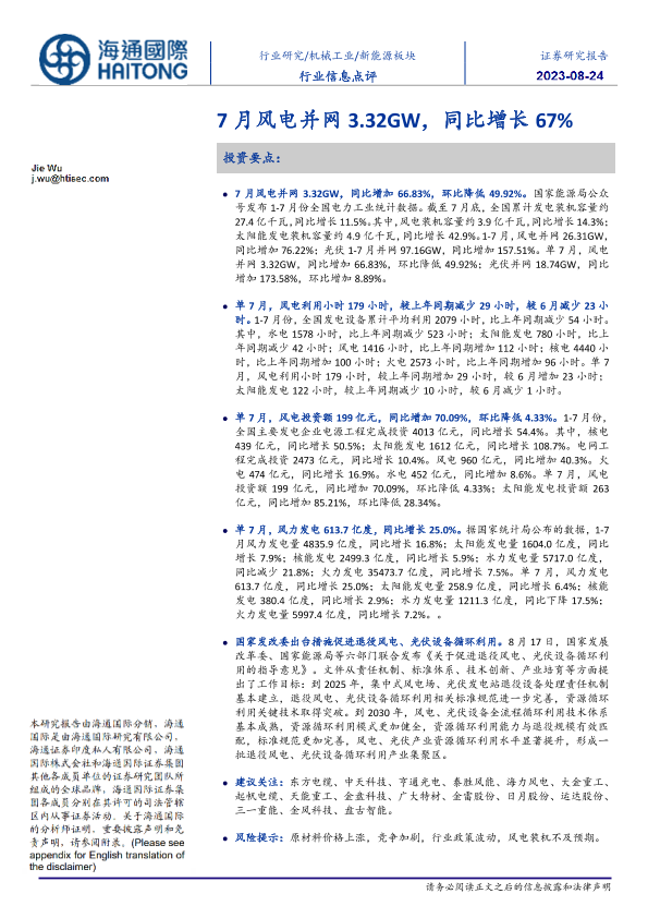 【海通国际】【20230824】20230824-海通国际-新能源板块行业信息点评:7月风电并网3.32GW,同比增长67%-10页