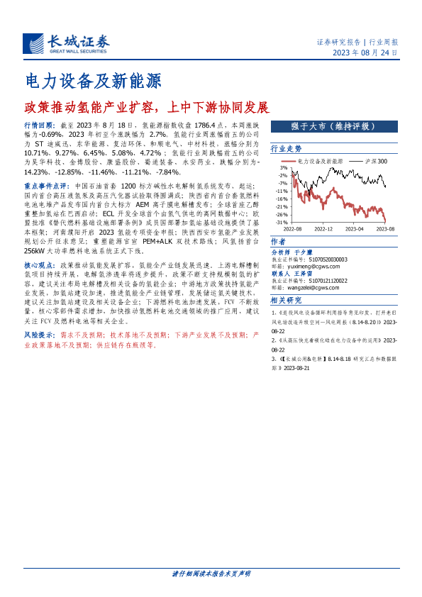 【长城证券】【20230824】20230824-长城证券-电力设备及新能源行业周报:政策推动氢能产业扩容,上中下游协同发展-10页