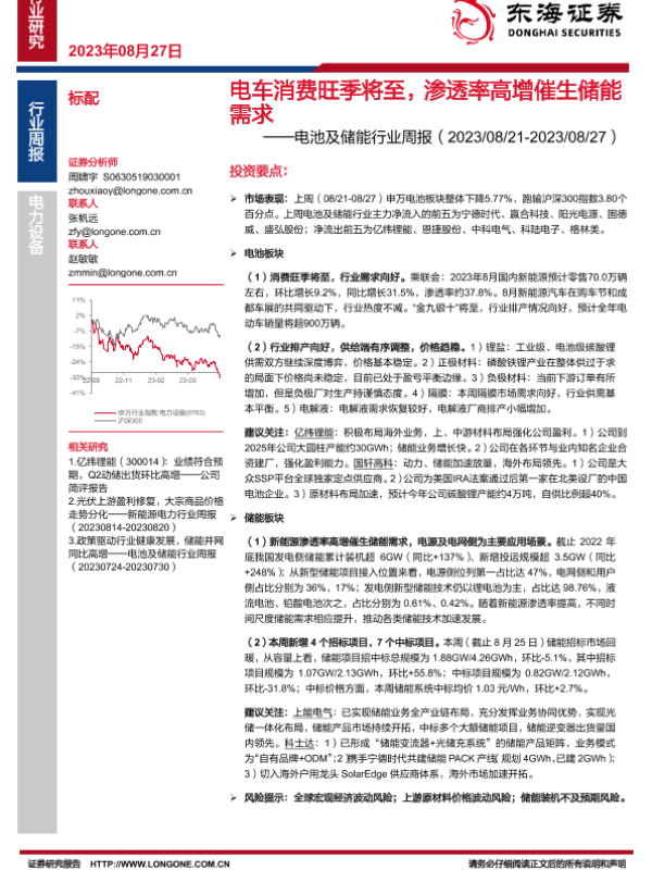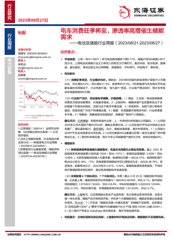 【东海证券】【20230827】电池及储能行业周报:电车消费旺季将至,渗透率高增催生储能需求-13页