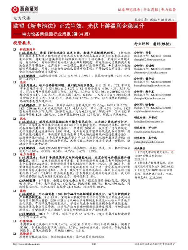 【浙商证券】【20230825】电力设备新能源行业周报(第34周):欧盟《新电池法》正式生效,光伏上游盈利企稳回升-43页