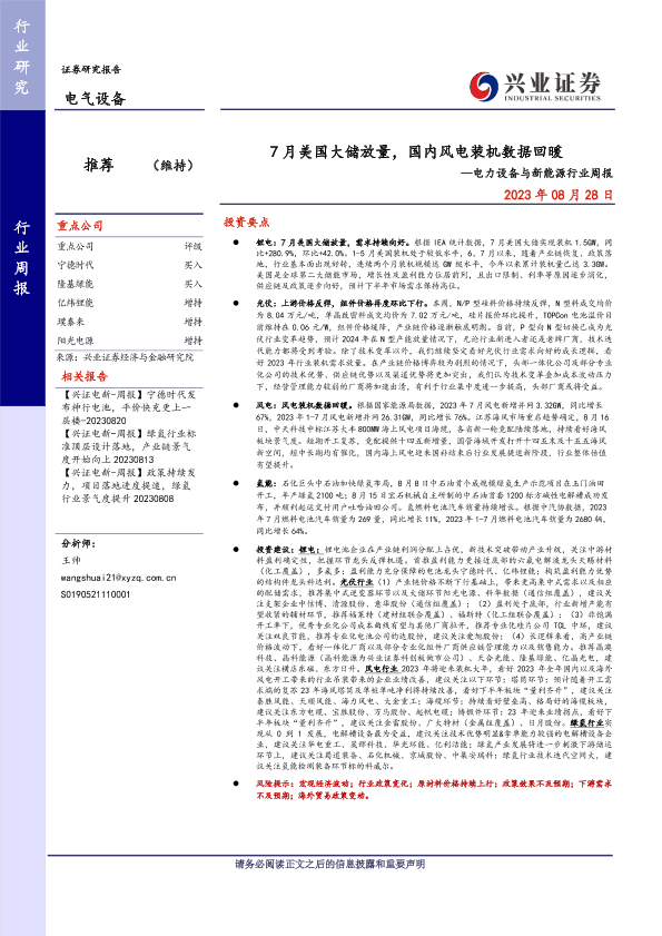 【兴业证券】【20230828】7月美国大储放量,国内风电装机数据回暖—电力设备与新能源行业周报-20页
