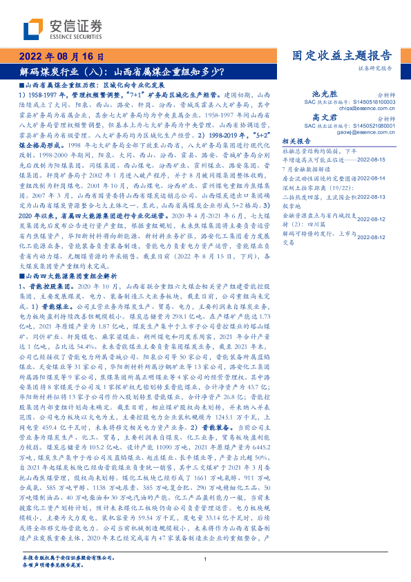 【安信证券】【20220816】固定收益主题报告:解码煤炭行业(八),山西省属煤企重组知多少?-20页