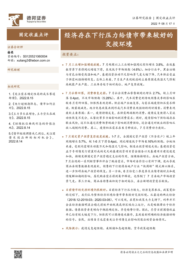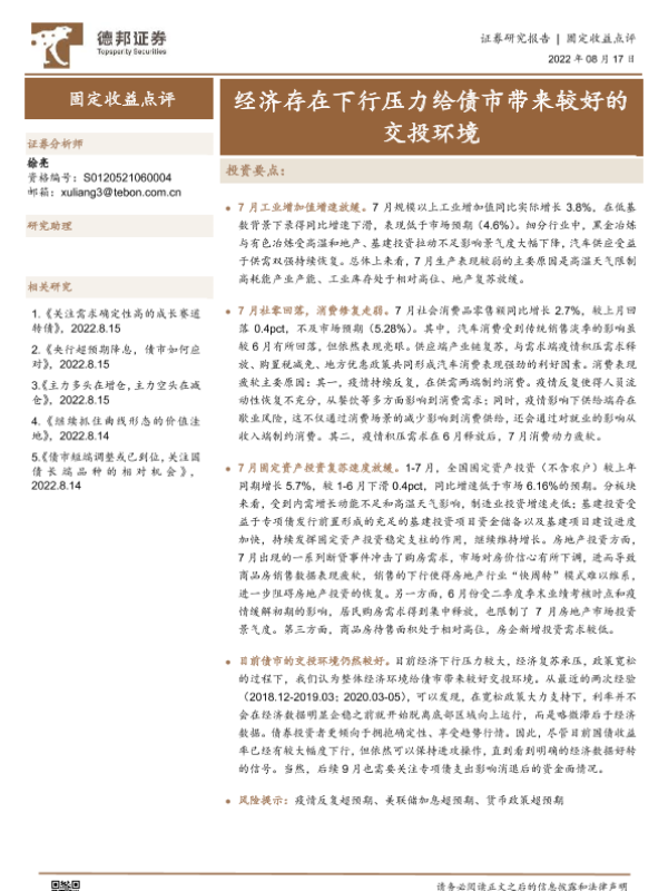 【德邦证券】【20220817】固定收益点评:经济存在下行压力给债市带来较好的交投环境-19页