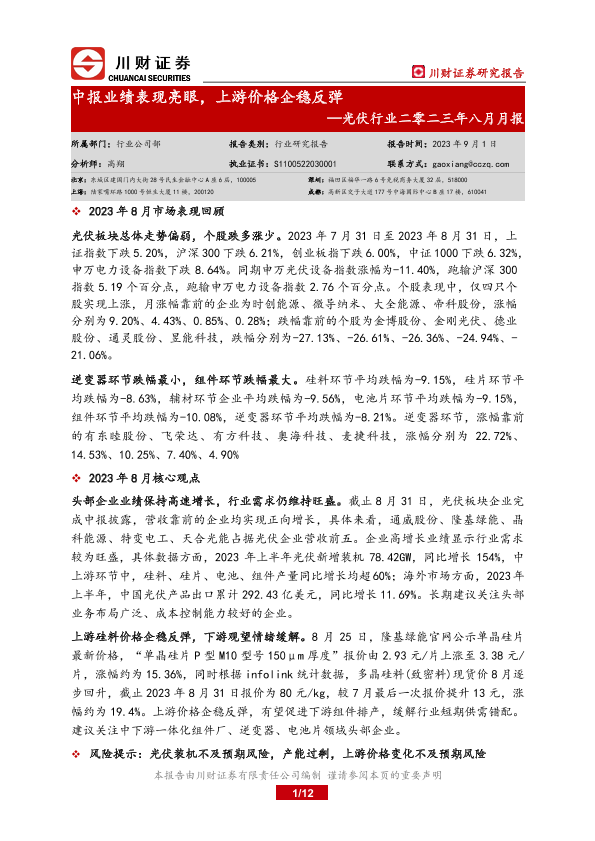 【川财证券】【20230901】光伏行业二零二三年八月月报:中报业绩表现亮眼,上游价格企稳反弹-12页