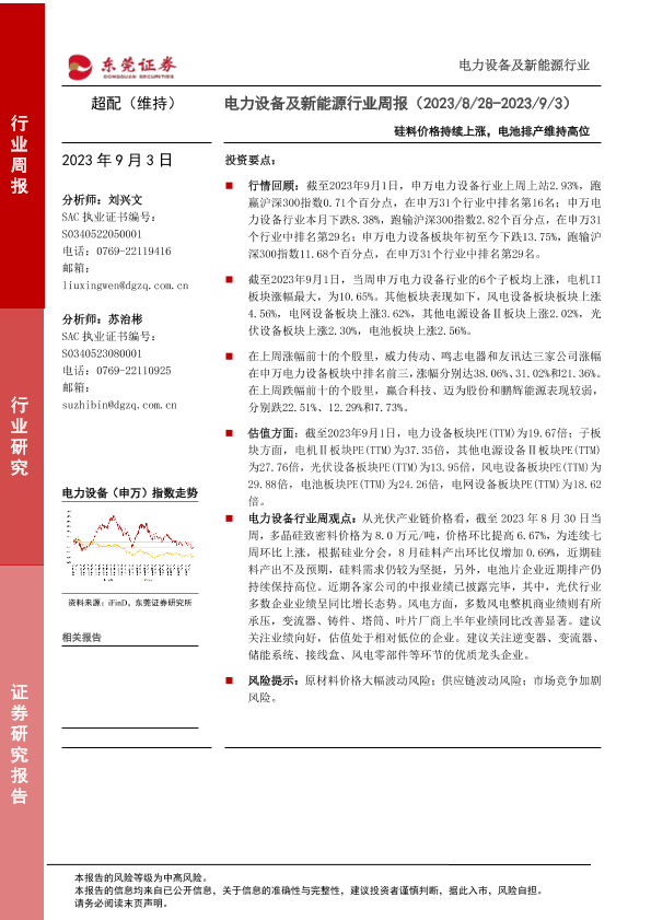 【东莞证券】【20230903】电力设备及新能源行业周报:硅料价格持续上涨,电池排产维持高位-12页