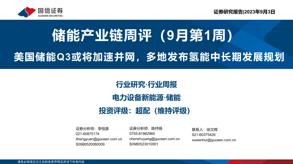 【国信证券】【20230903】储能产业链周评(9月第1周):美国储能Q3或将加速并网,多地发布氢能中长期发展规划-29页