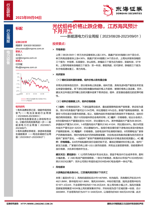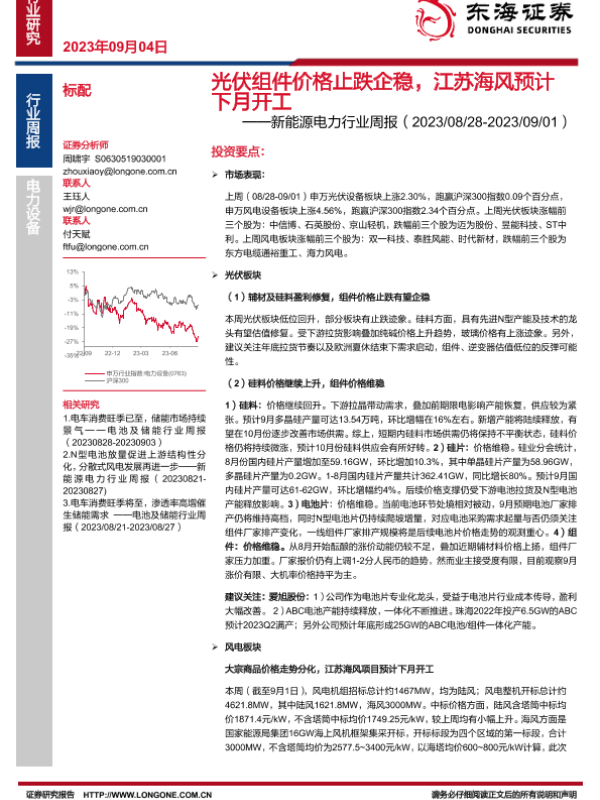 【东海证券】【20230904】20230904-东海证券-新能源电力行业周报:光伏组件价格止跌企稳,江苏海风预计下月开工-18页