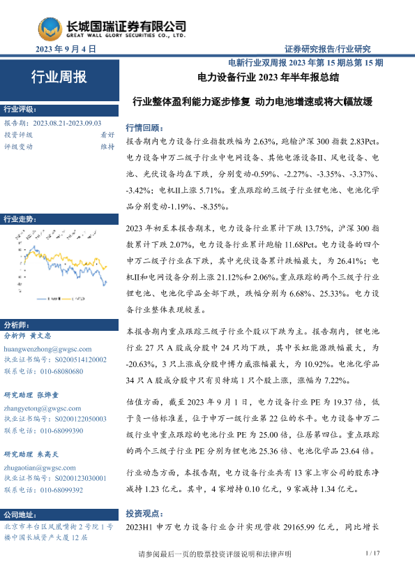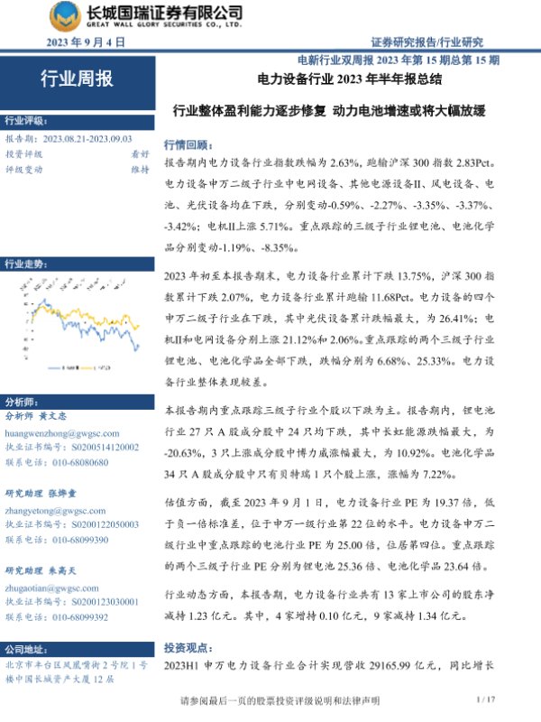 【长城国瑞证券】【20230904】电力设备行业2023年半年报总结:行业整体盈利能力逐步修复 动力电池增速或将大幅放缓-17页