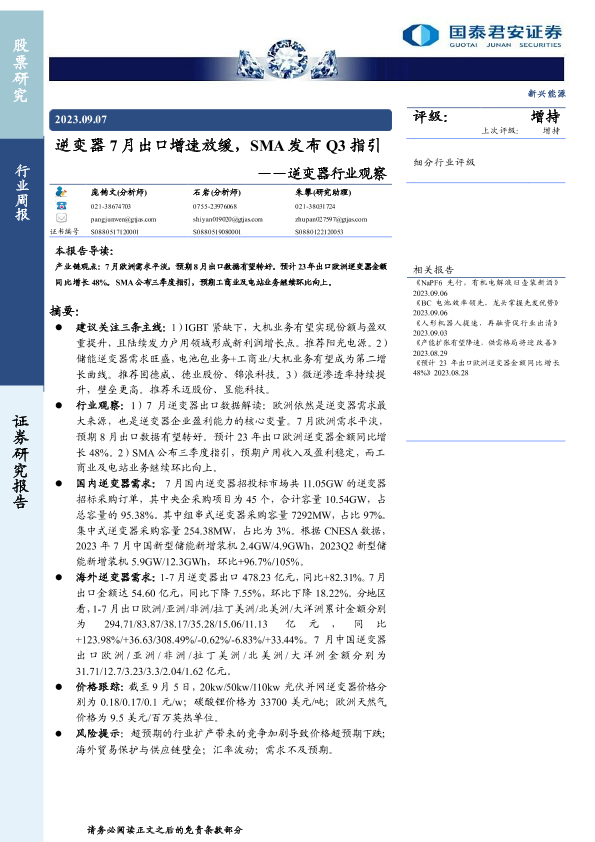 【国泰君安证券】【20230907】逆变器7月出口增速放缓,SMA发布Q3指引-24页