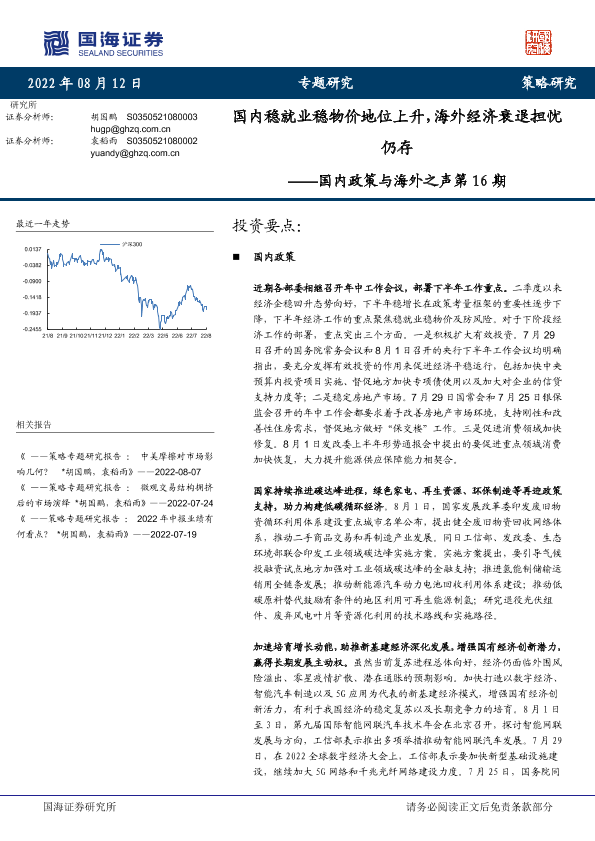 【国海证券】【20220812】国内政策与海外之声第16期:国内稳就业稳物价地位上升,海外经济衰退担忧仍存-21页