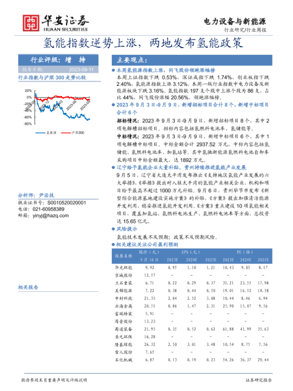【华安证券】【20230911】20230910-华安证券-电力设备与新能源行业周报:氢能指数逆势上涨,两地发布氢能政策-12页