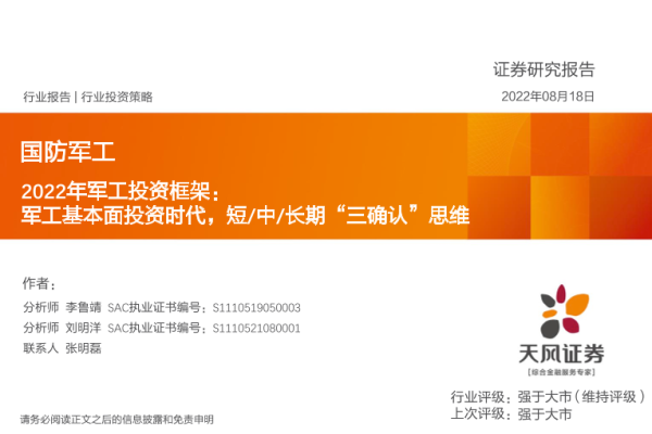 【天风证券】【20220818】国防军工行业2022年军工投资框架:军工基本面投资时代,短中长期“三确认”思维-63页
