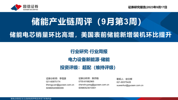 【国信证券】【20230917】储能产业链周评(9月第3周):储能电芯销量环比高增,美国表前储能新增装机环比提升-29页