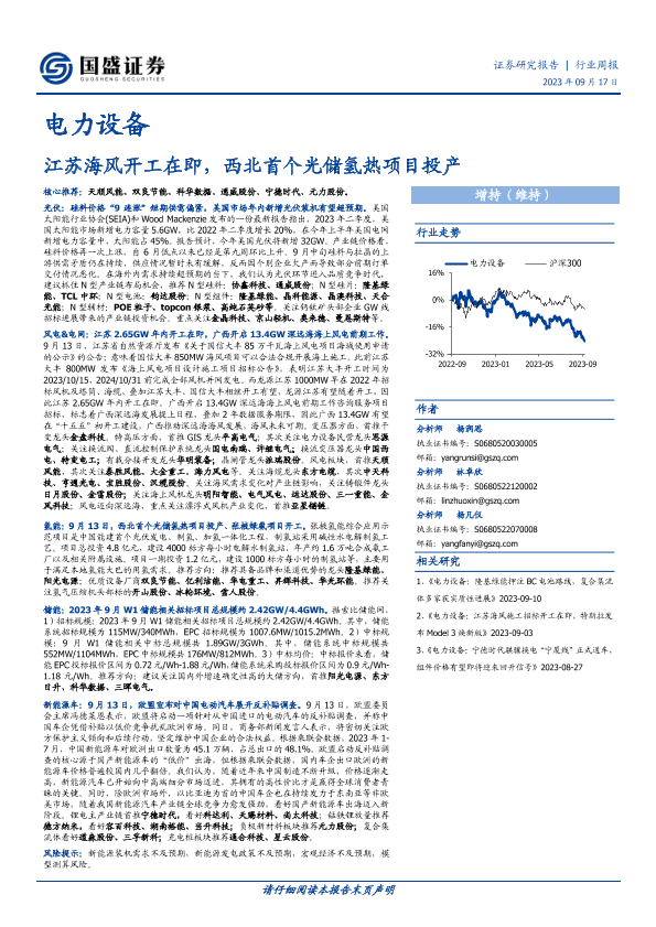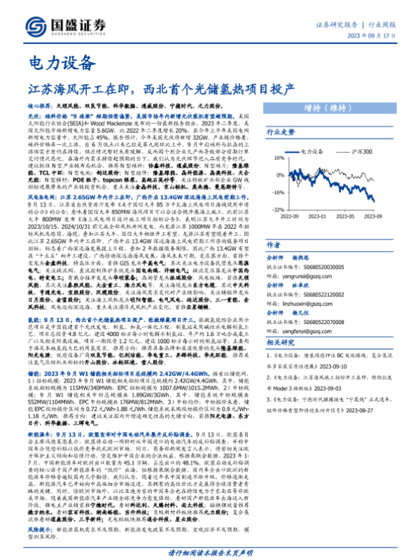 【国盛证券】【20230917】电力设备行业周报:江苏海风开工在即,西北首个光储氢热项目投产-19页